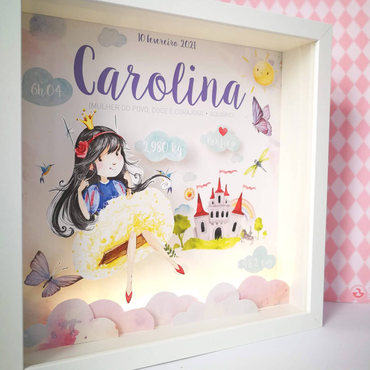 O Quadro de Nascimento Princesa no Mundo Encantado está disponível na versão com luz, para que o quadro possa funcionar como luz de presença, e/ou com música, que poderá ser selecionada por nós ou por si.