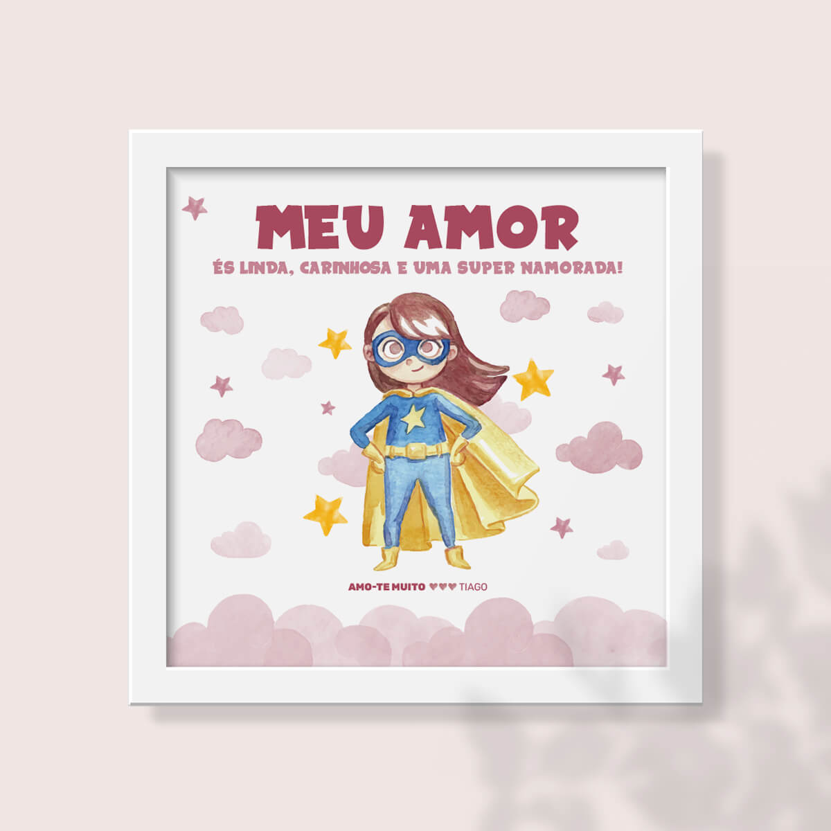 O Quadro Super Namorada pode ainda ser personalizado com um nome ou uma data comemorativa. Para isso, apenas terá de preencher a opção “Quer acrescentar o nome de quem oferece?”. Dessa maneira, estará a criar uma prenda original para a sua namorada que será única.